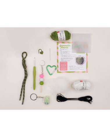 CCrochetez une grenouille fleurie et une tasse de thé matcha avec le kit Matcha Club.