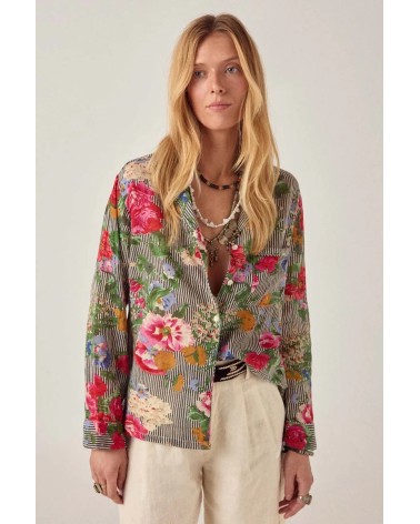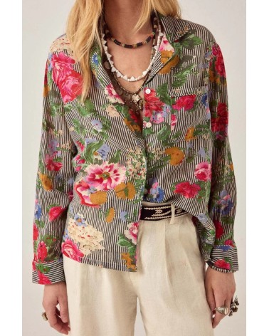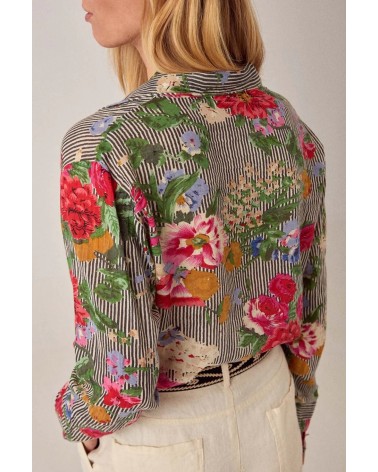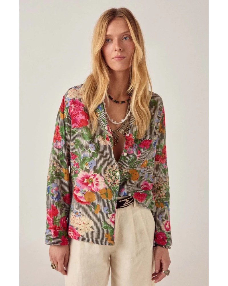 Chemise décontractée en coton à fines rayures et imprimé floral. Col classique, devant boutonné, poche poitrine, manches longues avec poignets doux. Inspiré par les silhouettes de pyjama. Les fines rayures servent de toile de fond, les fleurs émergent naturellement à travers le tissu.