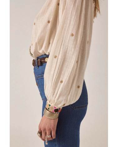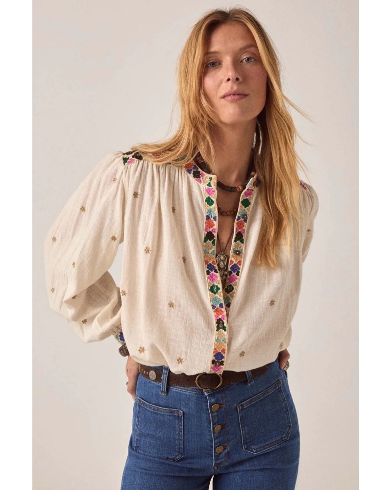 Chemisier à manches longues en gaze de coton slub avec broderie éparse sur le corps. Broderie florale multicolore à l'encolure et à la patte. Coupe détendue et fluide. Base blanc cassé.