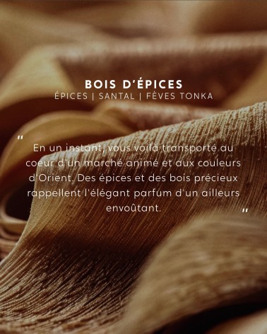 Il suffit d’un pschitt pour que notre spray parfumé Bois d'épices diffuse instantanément un parfum durable. En un instant, vous voilà transporté au cœur d’un marché animé et coloré d’Orient.