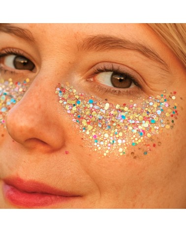 Paillettes à base de plantes dorées, sublimées par des touches roses, turquoises et argentées ✨. Parfaites pour vos make-ups de festival, de soirée ou du quotidien !