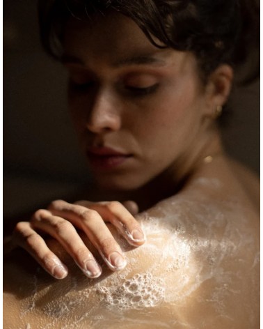 Utilisation : Sur peau mouillée, faire mousser directement ou frotter dans les mains, appliquer sur tout le corps, puis rincer.