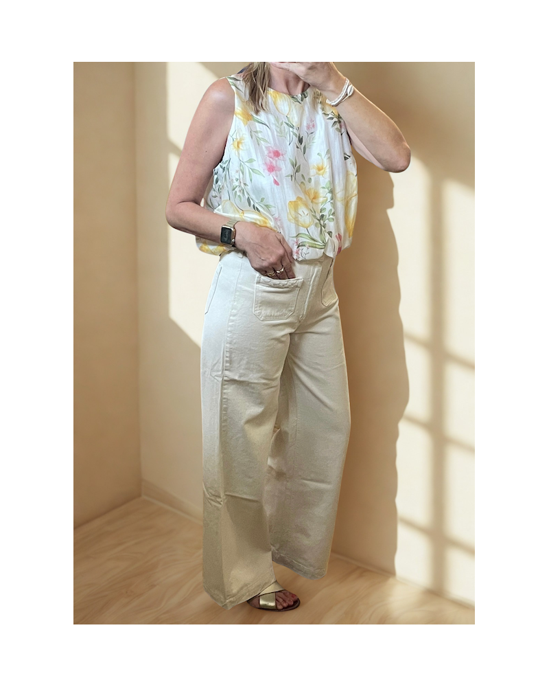Top Gaby - Motif Fleuri fond ivoire élastique à la taille